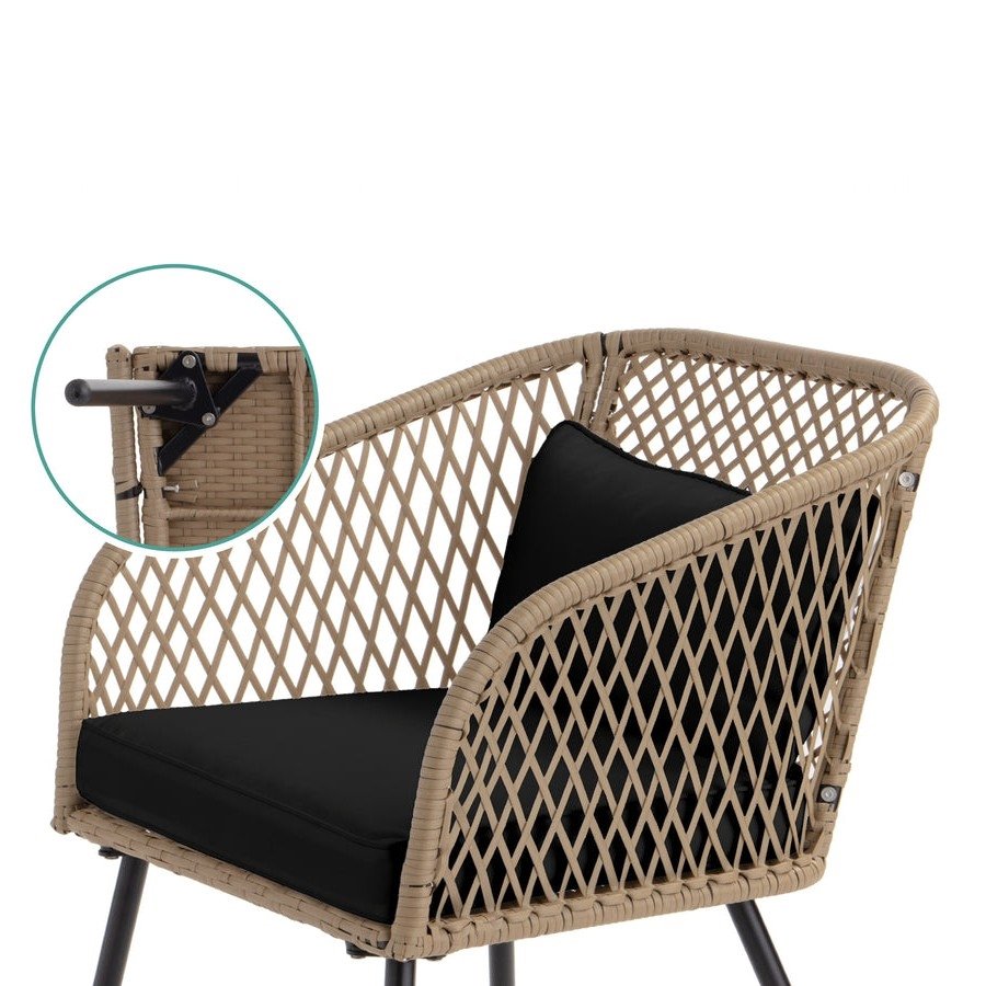 Sit back and relax in style with this 3 Piece Beige/Black Outdoor Weave Wicker Bistro w/ Tempered Glass Side Table Set. This set has an extra large profile to provide ample room for you and your guest. A sturdy powder-coated steel frame wrapped in handwoven wicker holds up to 250 lbs. These sturdy chairs come with a 3 inch thick black padded seat and back cushions to provide a soft and comfortable sitting experience. The seat's depth provides lots of space while the open weave allows a cooling cross breeze for added comfort. Also comes with a convenient side table features a textured, tempered glass top that holds up to 50 lbs.