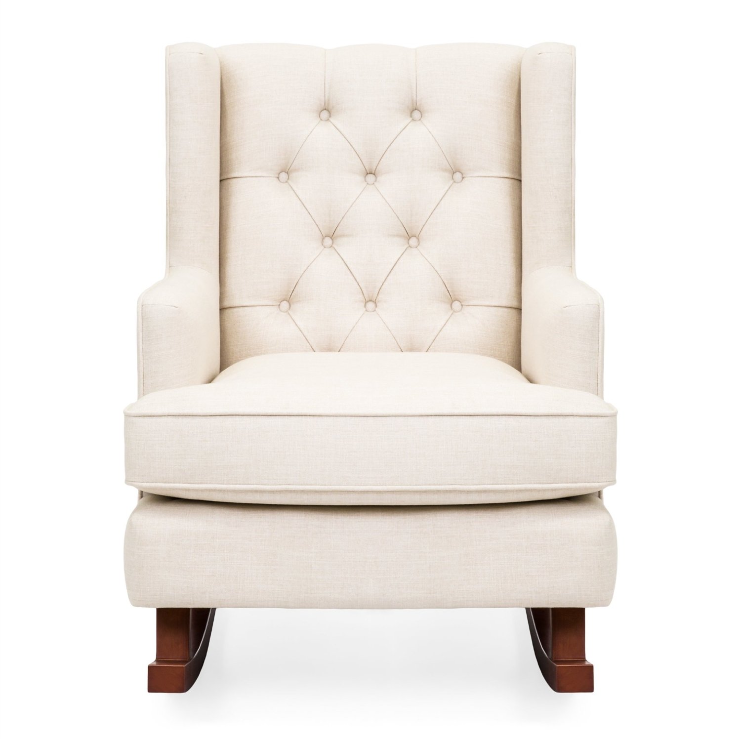 Rock into winter with this Beige Soft Tufted Upholstered Wingback Rocker Rocking Chair. The modern design adds an element of elegance to your living space, while its soft cushioning creates an inviting appeal. This extra soft rocking chair is made of high-quality fabric with a button-tufted backrest to provide increased levels of comfort. Enclosed arm and headrest makes this relaxing furniture piece ideal for rocking little ones to sleep or just nod-off yourself. This sturdy chair is crafted with solid hard wood rails that are specially made to stay still until the user is ready to rock. Get rocking!