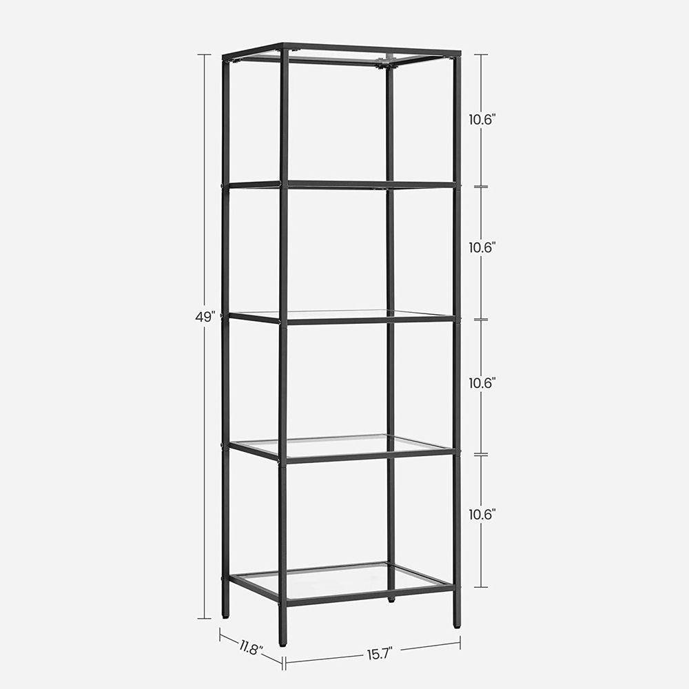 With the sturdy steel frame and premium tempered glass shelves, this Black Metal Frame Glass Shelf Bookcase 4-Shelves Shelving Unit supports up to 22 lb per level. The included adjustable feet and anti-tip devices add to the stability. Hold stacks of books in the home office? House towels in the bathroom? Display your favorite trinkets in the living room? This 5-tier shelving unit serves all these purposes. Numbered parts and easy-to-follow instructions will help you finish the assembly of this 5-tier black bookcase easily in jig time. Straight lines, glass panels, and a black steel frame...place this simple yet black shelf in your home and create a luxurious ambience. A space-saving glass shelf (11.8"D x 15.7îW x 49îH), anti-tip devices for stability, illustrated instructions for easy assembly, and a chance to make your home a bit more luxurious.