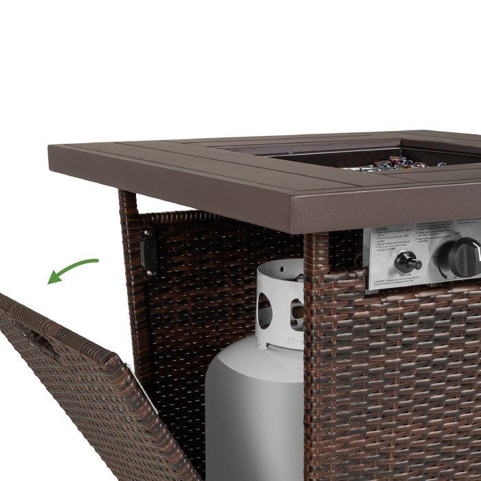 Make your winters warm and cozy outside with this 50,000 BTU Brown Wicker LP Gas Propane w/ Faux Wood Tabletop and Cover. Use a 20-pound propane tank to fill your patio or sitting space with fully adjustable, radiant heat for hours of outdoor enjoyment. Propane tank not included. Convenient gas tank holder is attached to the magnetic side door, so you can quickly change and conceal your propane tank. High-quality, weather-resistant wicker is woven over a sturdy, steel frame, with a durable fabric cover to ensure this fire pit table will withstand the elements. Take the lid off the built-in side hooks and cover the pit to add more space for family and friends to enjoy a light meal. Ignite an inviting flame over a removable bed of glass beads that trap and disperse heat while resisting corrosion.
