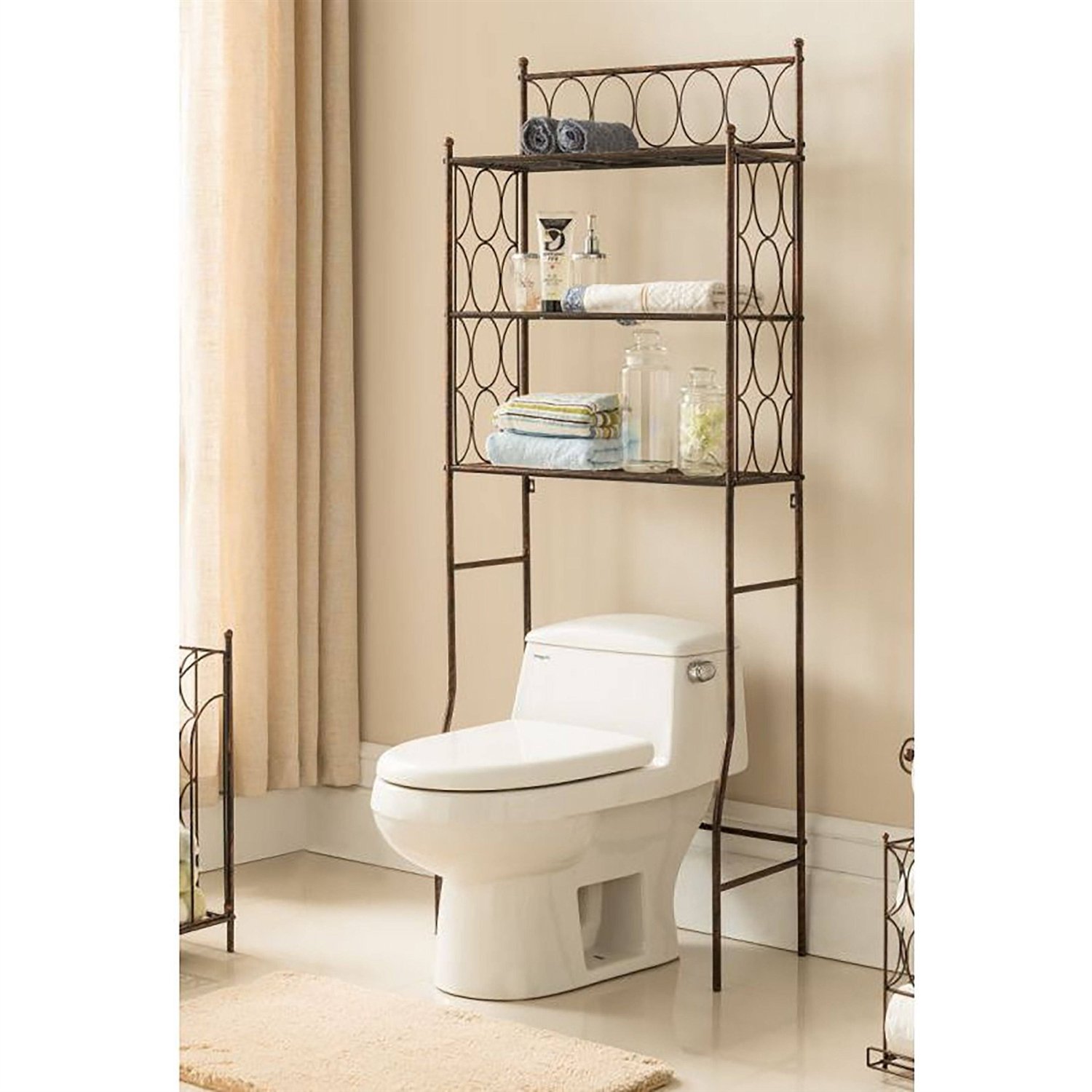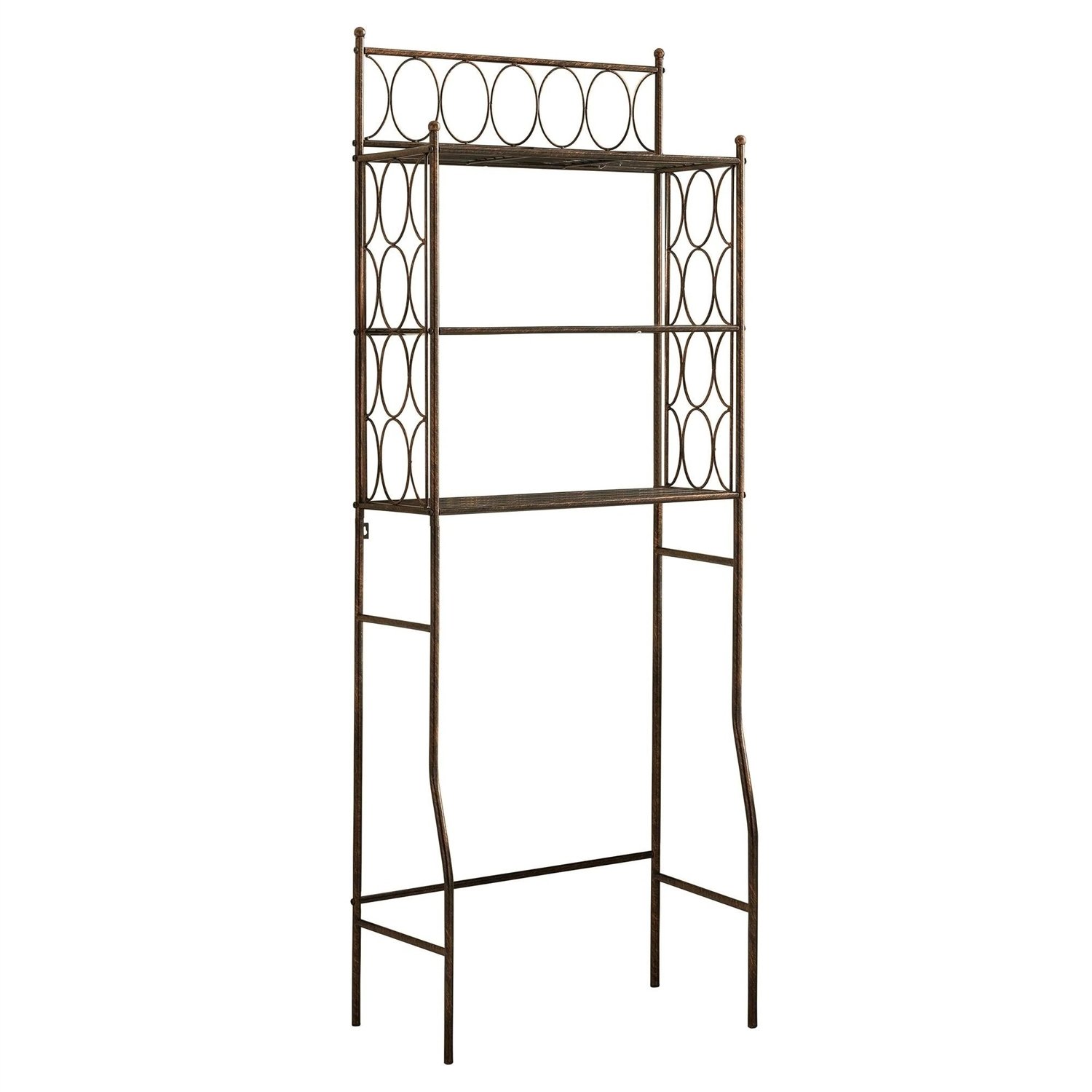 Make the unused space over your toilet functional and stylish with the Brushed Copper Finish Iron 3 Tier Bathroom Rack. This unique metal rack with brushed copper finish is designed to fit over any size toilet. It offers three slatted tiers an open elliptical details.