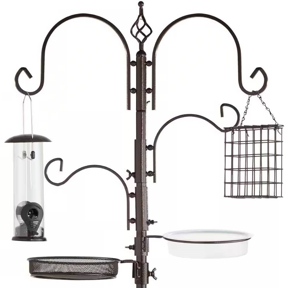This Complete Bird Feeder Set with Bronze Metal Stand Suet Water Bowl Tube and Tray comes complete with four feeders: a wire feeder, peanut feeder, tube feeder, and suet feeder, as well as a water bowl and additional food tray. The durable hooks are excellent hangers for feeders as well as wind chimes, birdhouses, and other decor. Threaded tubes come together while a set of wingnuts secure additional hooks or feeder stations before staking the pole into the ground. Made entirely of durable steel, this feeding station features a long anchor to withstand the wind and allow feathery friends to stop by for years to come. At 89 inches tall, this feeder station will help attract dozens of birds and improve your gardening experience.