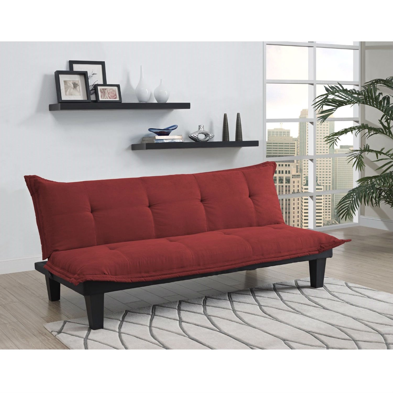 Add a personal touch to your home with this Contemporary Futon Style Sleeper Sofa Bed in Red Microfiber. Perfectly sized for small spaces, the simple yet unique design, lends a relaxed and sophisticated look. The lush, microfiber upholstery, extra-padded seats and modern tufting, make it ideal for any room dÈcor. The multi-position back features a Click-Clack mechanism that easily converts this futon to a sleeper. Maximize your space with functionality, style and comfort with the DHP Lodge Futon!.