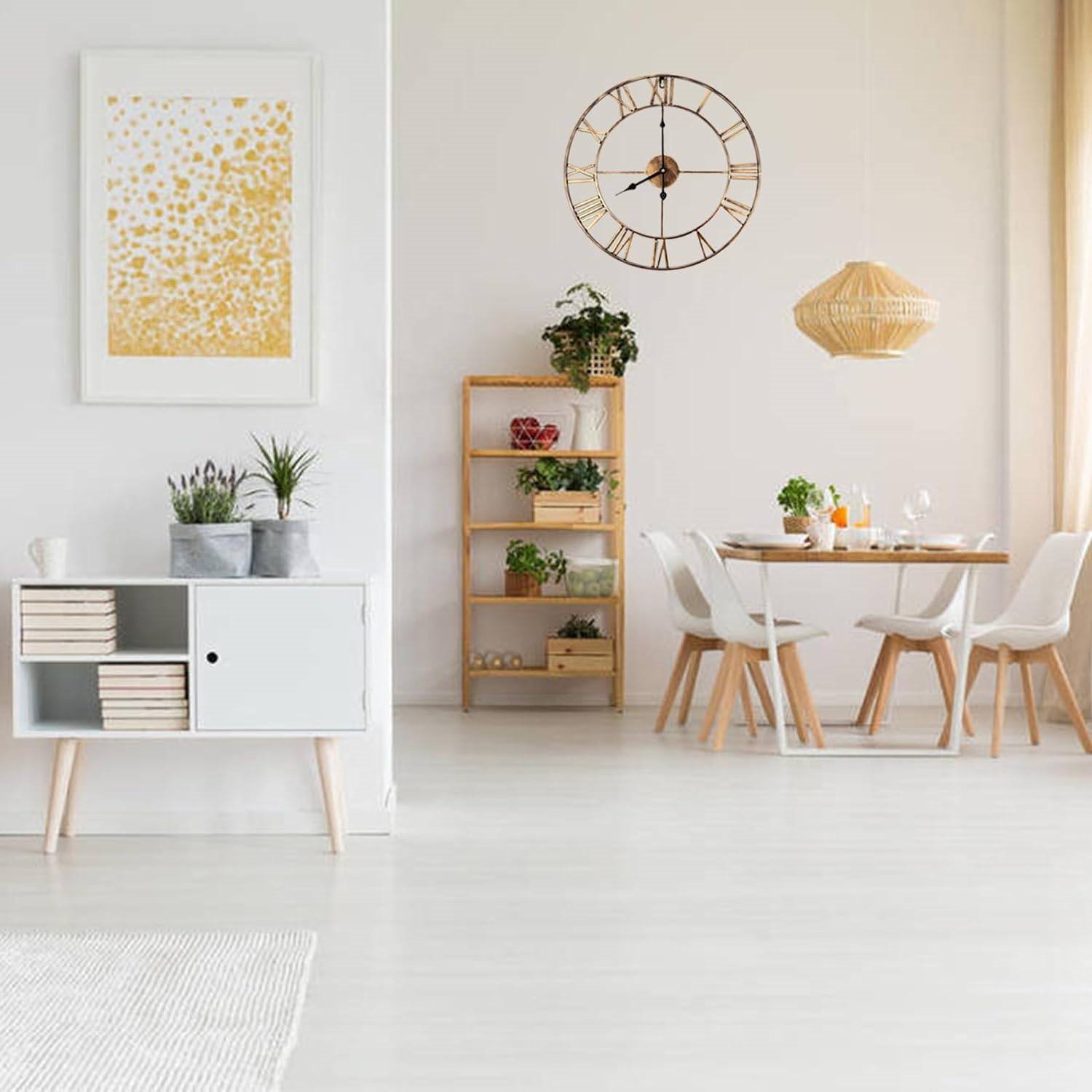 This Decorative 18.5-inch Roman Numerals Silent Non-Ticking Wall Clock in Gold is an oversized iron wall clock with European retro style and no frame surface. Enjoy a vintage display on the wall with a fashion pattern available, best decoration. Diameter: 18.5î(47cm) Classic and elegant and looks great on the wall of the living room, bedroom, kitchen, hallway, office, study, cafe, hotel, restaurant etc. Handmade iron metal, classic industrial Roman Numerals, with hand painted vintage color. Famous Qualify Quartz Sweep Movement and no second design guarantees accurate time & absolutely silent environment. Recommended AA ordinary Carbon Zinc or Heavy Duty battery (NOT Included), excluding Alkaline battery.