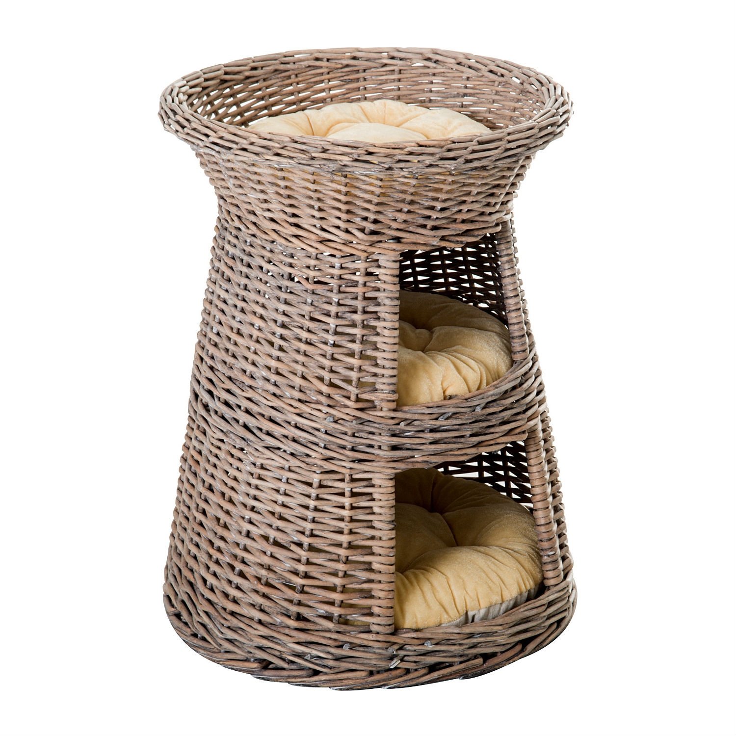 Stimulate your cat's natural instincts to jump and lounge with the Eco Friendly 3 Tier Round Rattan Wicker Elevated Cat Condo Bed Beige. Provides a soft comfortable haven for security and rest. Made of natural Eco Friendly wicker and very sturdy.