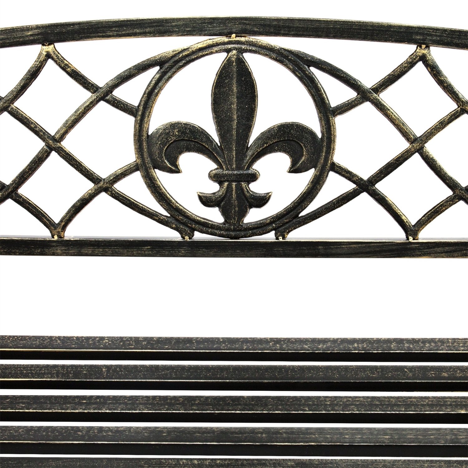 Swing in style with the Farm Home Bronze Sturdy 2 Seat Porch Swing Bench Scroll Accents. Crafted with a sleek, rustic design sure to blend well with your home's porch or patio decor. This classic, eye-catching swing bench boasts a fleur-de-lis design in the center of its back for a touch of refined beauty.Lounge outside for some you time or hang out with a friend, as the bench can easily seat 2 people. Made of heavy-duty metal, this bench withstands the elements to resist rust buildup and last through the years.