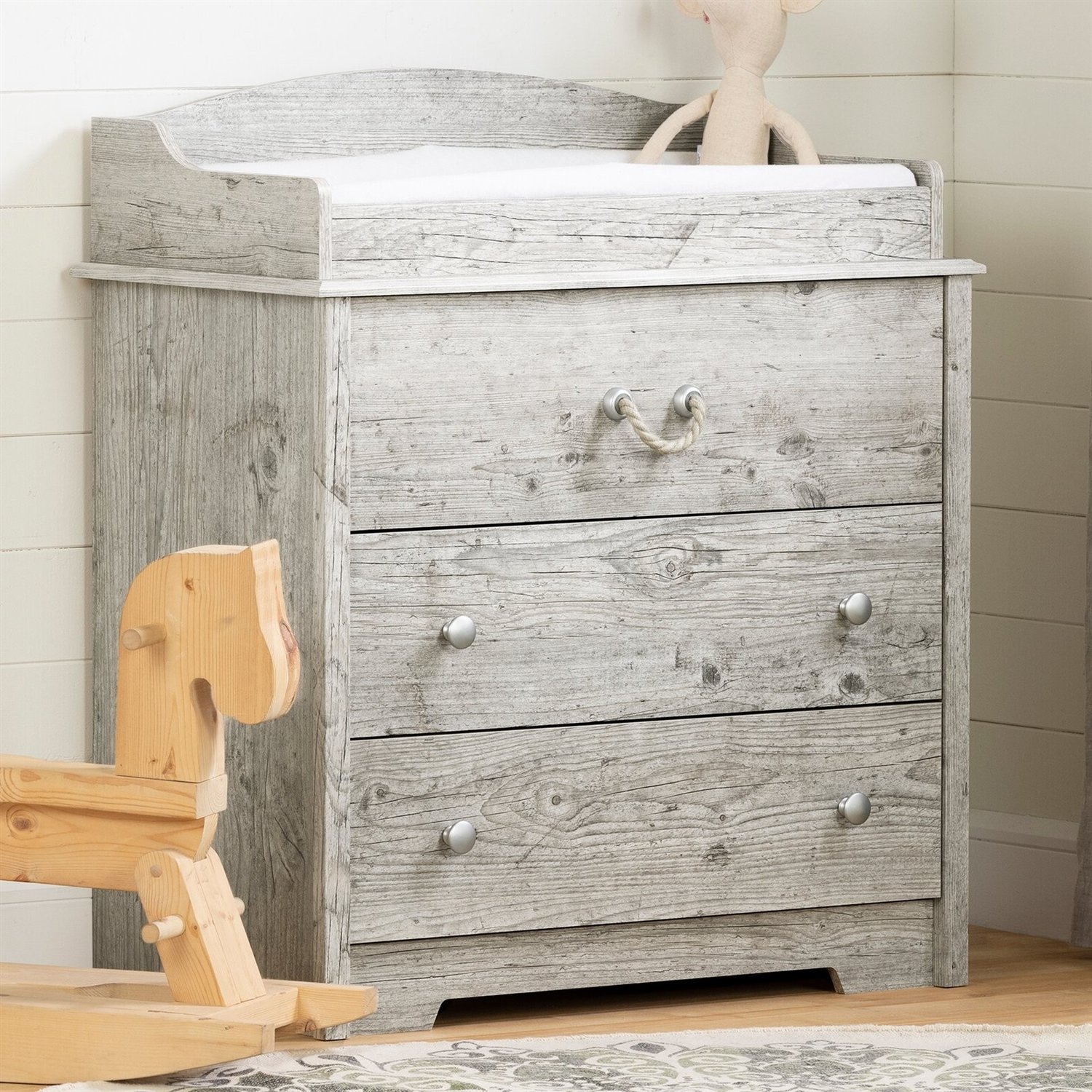 Bring rustic nautical charm with this stylish changing table turned dresser to add coastal flair to any room. The Farmhouse Nautical 3 Drawer Rope Handle Baby Changing Table in Washed Pine is sure to be the centerpiece of your nursery, and its handy storage spaces make it really useful. The top drawer features an easy to pull rope-like handle and the bottom two drawers with cute knobs. Versatile Storage This changing table features 3 large drawers with smooth metal slides for quiet and easy access.