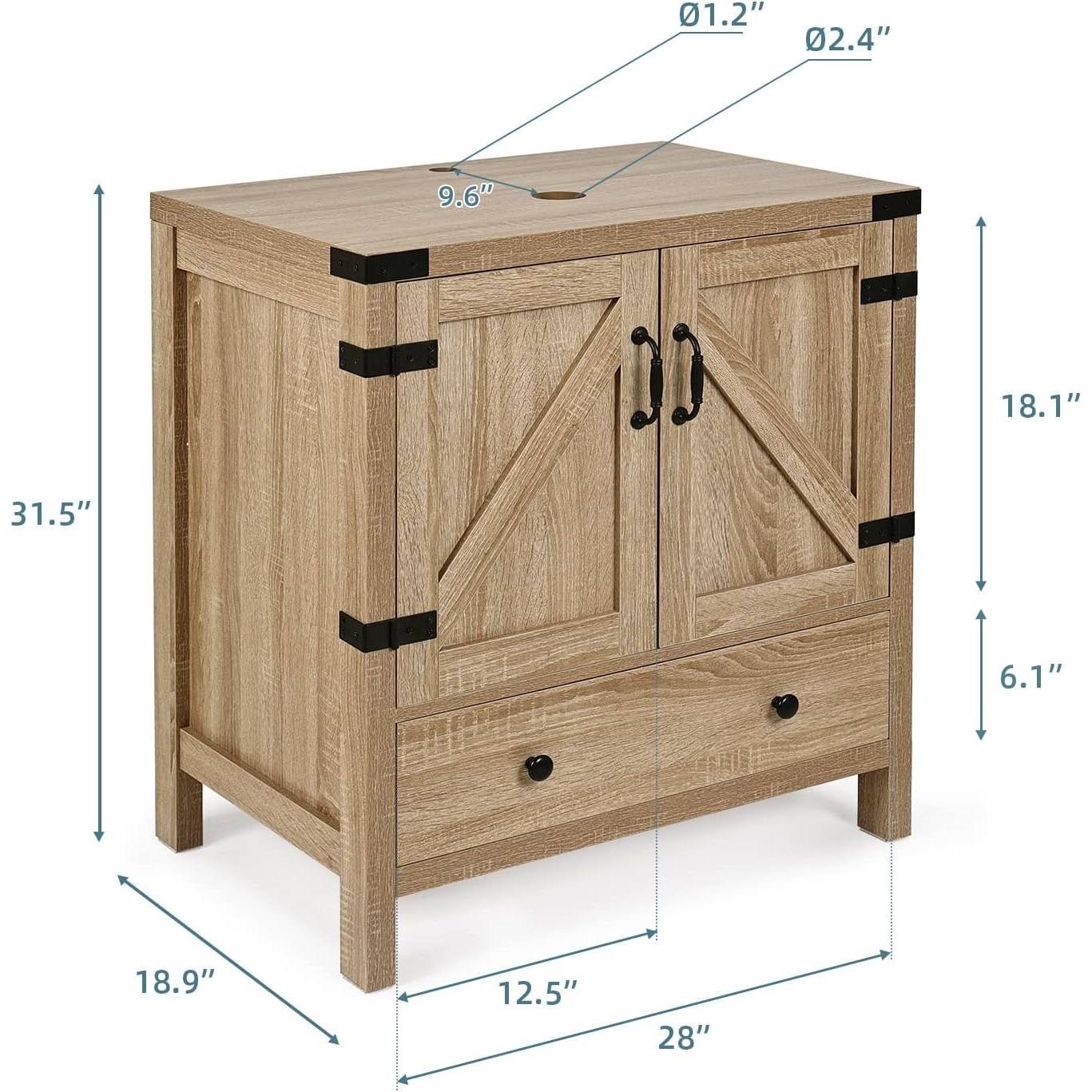 This Farmhouse Wood Finish Bathroom Vanity w/ Blue Glass Sink Black Faucet and Drain is made of Eco-MDF wood for long-lasting durability. Careful Coverage and Eco paint enable durability. Cabinet: 19"x 28"x 31.5"(D◊W◊ H); Sink dimension: 21" x 6.3" (W xD); Bowl thickness: 0.5". Scratch-resistant & Polished surface is easy to clean up. Come with Vanity, Glass sink, ORB Faucet, Pop up drain, Hot/ cold lines, and some mounting hardware. Modern and stylish design fit perfectly with most bathroom decor; Easy installation.