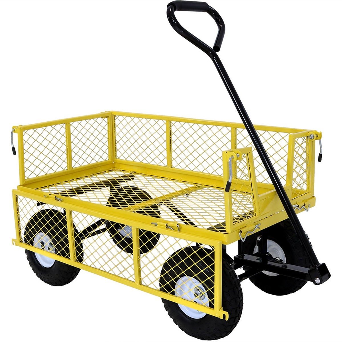 With a 660-pound hauling capacity, the options are endless when it comes to moving large items with this Heavy Duty Yellow Wheelbarrow Steel Log Garden Cart. The multi-use wagon sides can be folded down or completely removed by pulling out the side pins, creating a useful flatbed cart. The convenient u-shaped quick-release hook located on the bottom of the frame makes unloading a quick and effortless process. The 70" collapsible wagon is made from durable steel mesh materials with a powder-coated finish making this product weather-resistant and long-lasting. The large D-shaped padded handle allows the utility cart to be towed or pulled by hand.