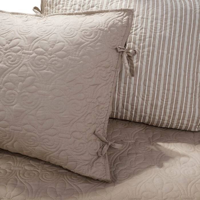 This Khaki Microfiber 6 Piece Reversible Daybed Cover Set includes 3 pillow shams, 1 accent pillow, 1 bed skirt, and 1 daybed cover. The daybed cover and shams flaunt a classic stitch pattern that creates a rich depth and texture on the face of the bedding set. A square decorative pillow with an elegant embroidery bed skirt adds the finishing touches to the daybed set.