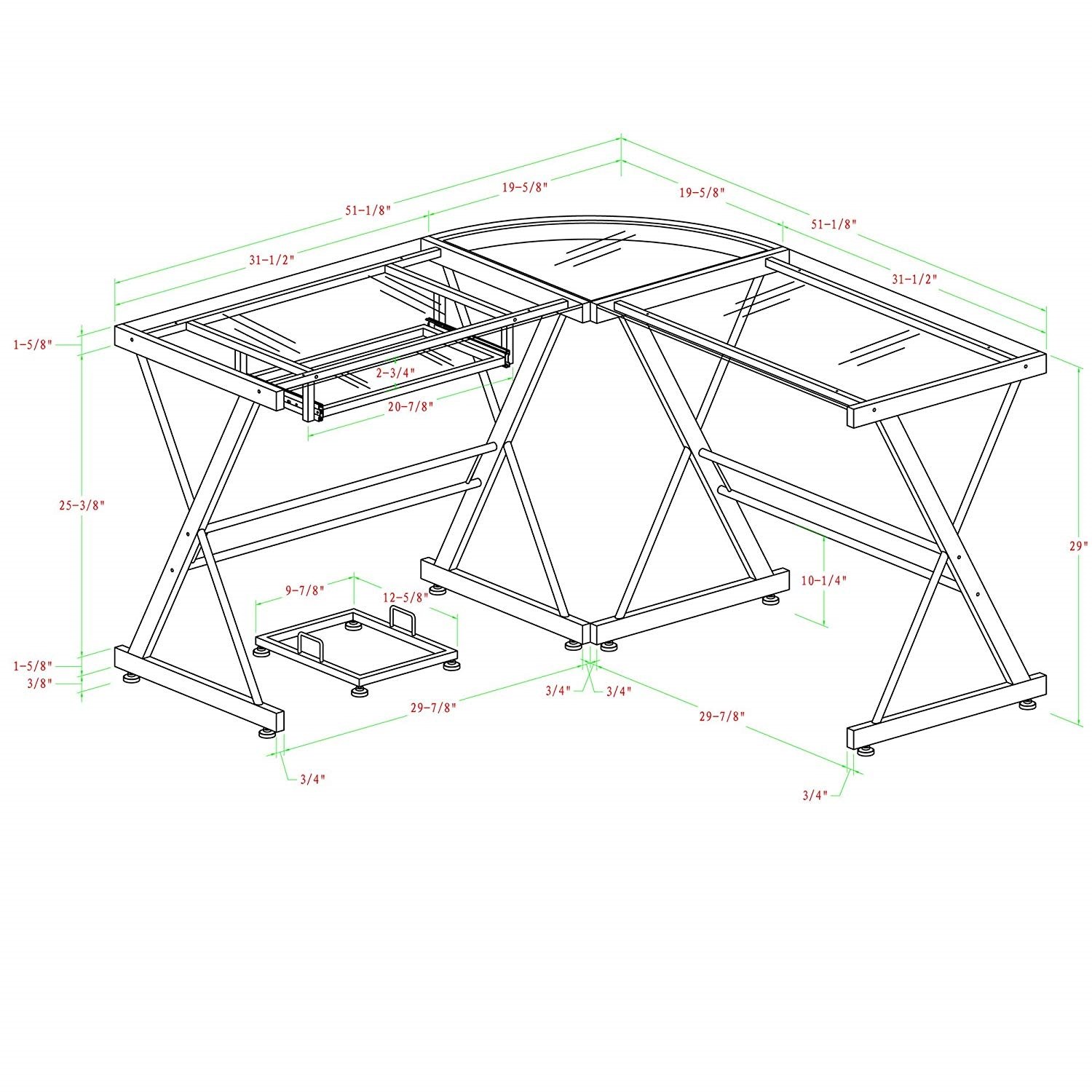 Architectural in styling and unmistakably modern, this Modern Corner Computer Desk in Metal and Glass provides ample workspace without weighing down the room. Durably fashioned from powder-coated steel tubing and tempered safety glass, the desk has an L-shape that fits neatly into corners and makes working more efficient. A sliding keyboard tray can attach to either side of the L, and a separate CPU stand is also included. Measuring 51 by 29 by 51 inches, the piece ships ready to assemble and coordinates with numerous Walker Edison TV and video stands for a fully coordinated home media room.