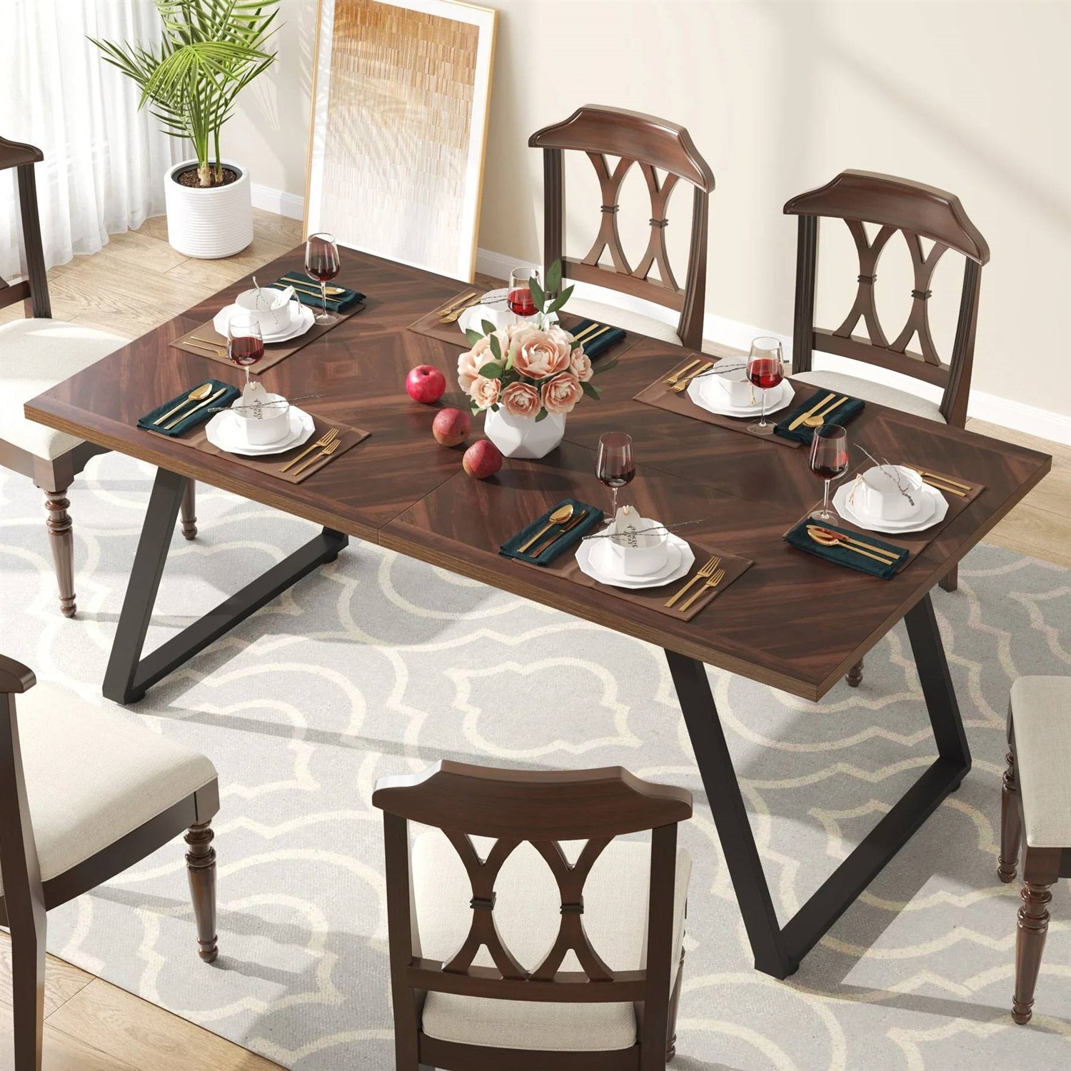 This Modern Farmhouse 63-inch Rectangle Dining Table Brown Wood Top Black Metal Frame in vintage is perfect for pairing with traditional, modern farmhouse, or country cottage aesthetics. Features a 1.18'' high-quality MDF tabletop and stable 2.36'' x 0.79'' metal steel legs structure, making it anti-scratch, stain-resistant, and water-resistant. The safe water-based paint polished surface gives it natural and smooth lines. (Size:31.5"D x 62.99" W x 28.74" H), A table full of character and plenty of room for family and friends. The compact tabletop can easily accommodate 4-6 people comfortably, it is suitable for small family dinners. Or the Perfect piece for your backyard patio. The height of the dining table is 29.92î, allowing you to stretch your feet easily while eating without feeling cramped. This kitchen table is a decent size for 4-6 people. This rectangular dining table is a great option for small Apartments. It provides enough space for meals and drinks, and the table is also lightweight and easy to move around.