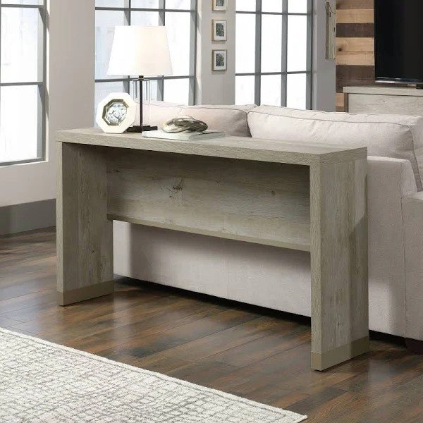 Give your living room a touch of of modern farmhouse beauty with the Modern Farmhouse Oak Living Room Console Sofa Table. Behind sofa table features a spacious top surface that provides you with the perfect amount of space to store and display a variety of different items like an accent lamp, decorative plants, your collection of photos. This narrow sofa table is finished on all sides for versatile placement throughout your home. Have it behind your couch or standing alone on a living room wall as a stunning accent piece. It looks great no matter where it stands! This modern sofa table also features powder coated metal end caps for an extra touch of detail that is sure to stand out in your home. Its strong and lightweight 1 æî panel construction makes it sturdy and easy to move. Finished in Farmhouse Oak, this one-of-a-kind sofa table is just what your living room needs.