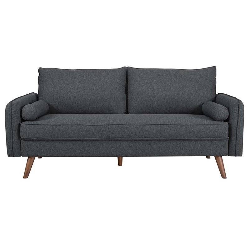 Give new vitality to your home or apartment living space with this Modern Grey Fabric Upholstered Sofa with Mid-Century Style Wood Legs. A comfortable yet tailored profile and two bolster pillows. It beckons guests to sit and stay a while. It's soft fabric upholstery grants this sofa an approachable appeal thatís echoed by it's calming color clean lines and splayed wood legs. Arriving directly to your doorstep in a convenient shipping box it easily unpacks to quickly become the most well-loved lounge spot in your home.