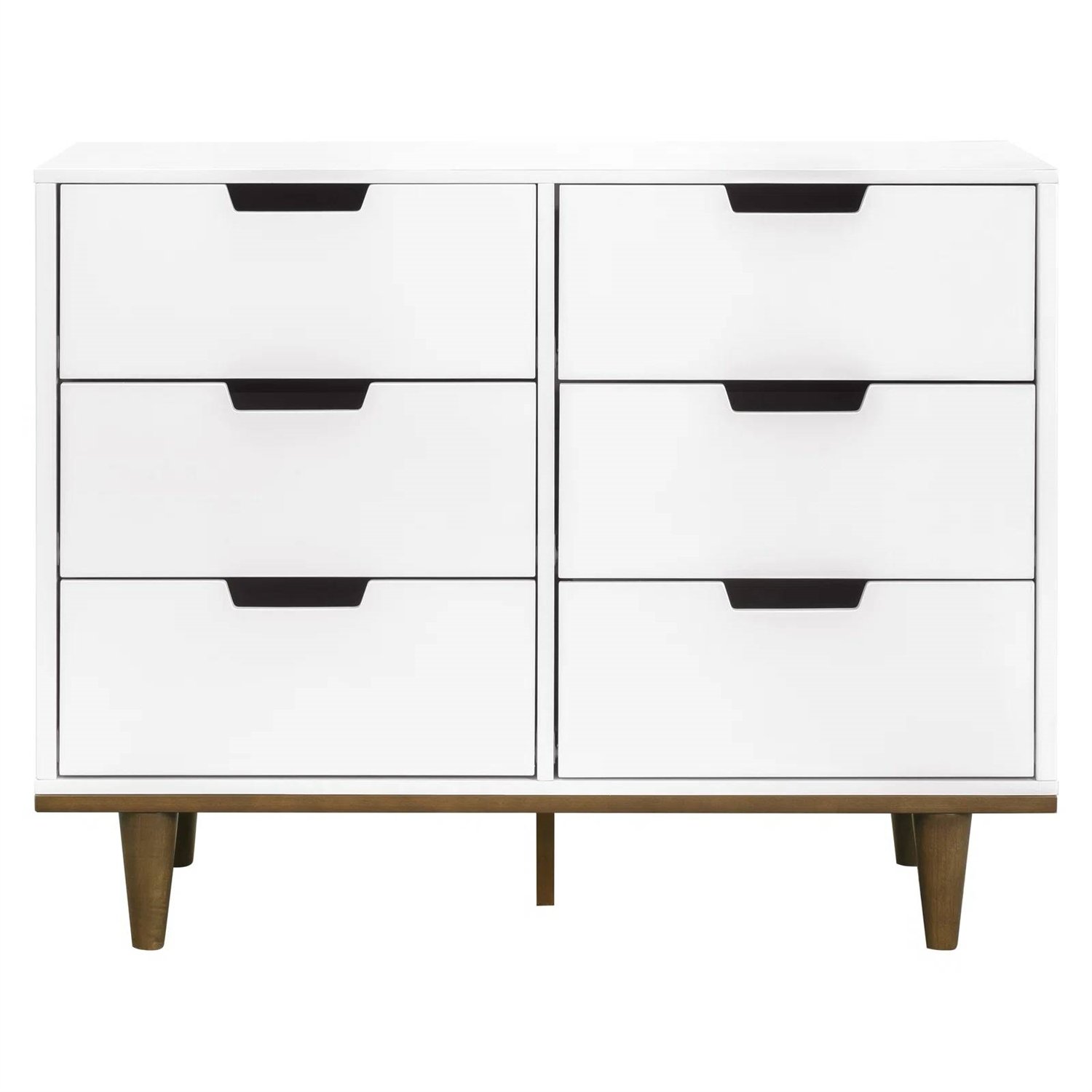 This Modern Mid-Century Style 6-Drawer Double Dresser in White Walnut Wood Finish features six spacious drawers with open finger pulls and a versatile, modern look. 6 spacious drawers that can hold all the adorable baby clothes, blankets, and more. Sturdy enough to last you through the years. Changing stations now. Big kid dresser later! This dresser is designed so that you can add a changing tray (#M0619) to use as a convenient changing station during the baby years. Euro drawer glides make opening the drawers easy even when your hands are full with your baby. We've done the hardest part for you! Drawer glides come pre-assembled so that you can put your dresser together more quickly and start enjoying your nursery sooner. Made of solid sustainable New Zealand pinewood and TSCA compliant engineered wood -only the best for your baby. Say goodbye to toxic chemicals! This dresser is lead and phthalate safe. Rest assured knowing it meets or exceeds ASTM International and U.S. CPSC safety standards. Stop mechanism and anti-tip kit included for additional safety. We've done the hardest part for you! Drawer glides come pre-assembled so that you can put your dresser together more quickly and start enjoying your nursery sooner.