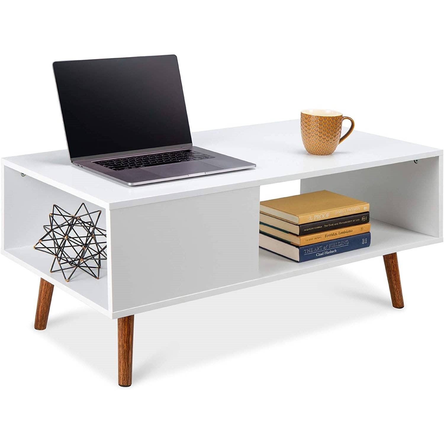 This Modern Mid-Century Style Coffee Table Living Room Storage in White Brown Wood is crafted with an open design, plus a natural wood-grain finish with subtly textured feel and mid-century modern appearance for simple yet fashionable charm in any living room.