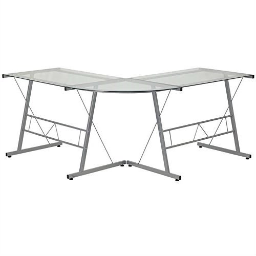 Home > Modern Silver Metal L-Shaped Desk with Glass Top and Floor Glides