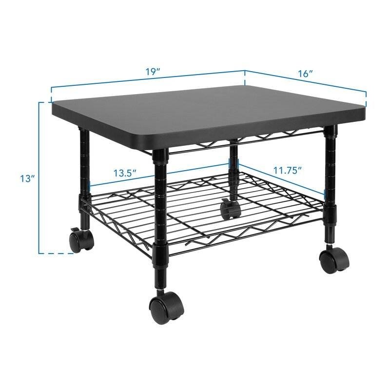 This under desk black printer cart with wheels holds printers, scanners, and fax machines off your desk. Clear out your desktop space for a more ergonomic, organized, and focused desk setup. This versatile and multi-functional cart is designed for use in offices, educational environments, mailrooms, cubicles, classrooms, dorm rooms, and libraries. Sturdy construction, simple assembly, storage shelves, and a wheeled base make it an ideal choice for a variety of home, office, and educational environments. The printer stand's steel frame and durable laminate top offer stability and durability. Heavy-duty design can hold up to 100 pounds of equipment and supplies - 50 pounds on each shelf.