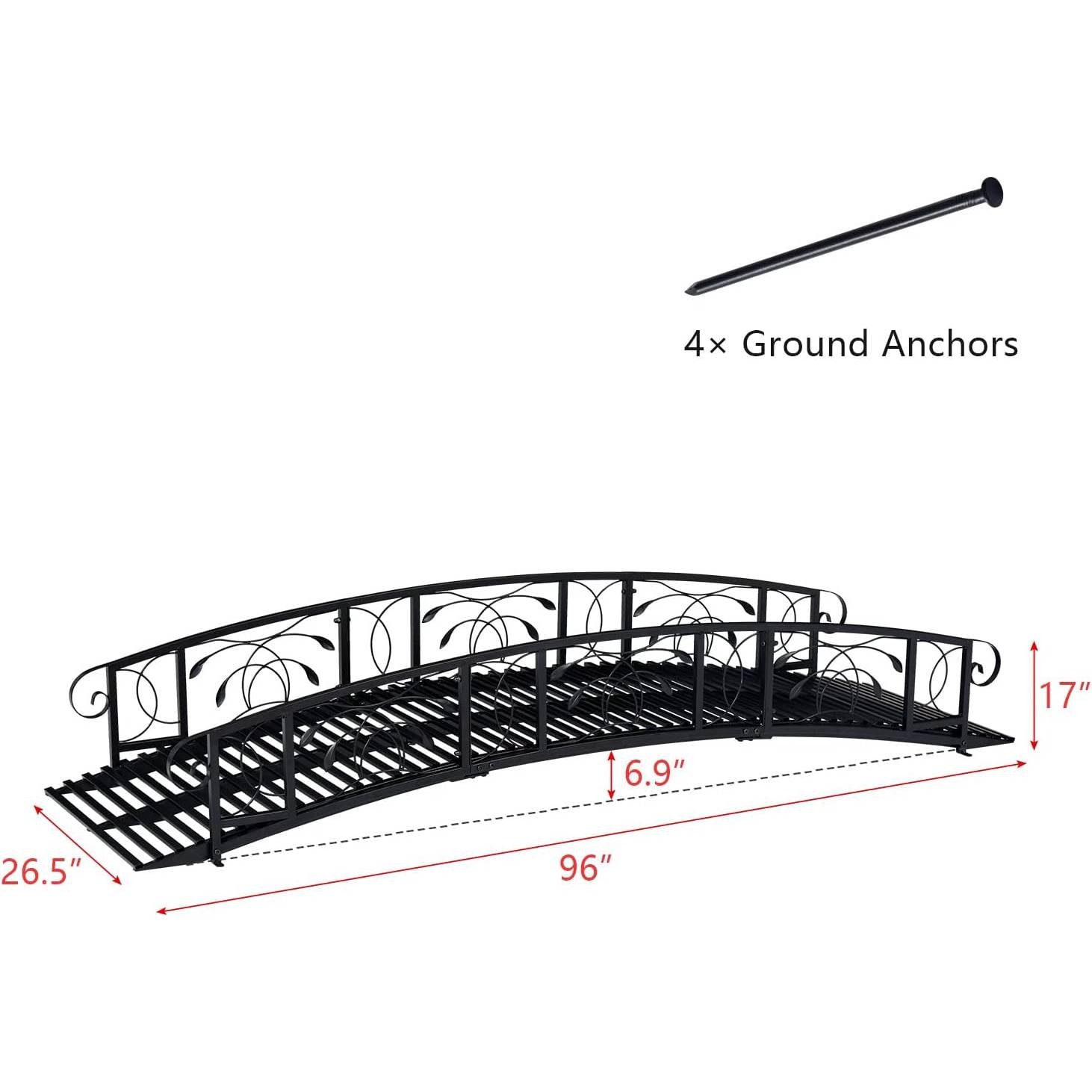 • Sturdy Construction: With solid metal and sturdy screws, our garden bridge can allow 2 to 3 people to stand on it. And there are 4 ground anchors that will be used to fix the bridge on the ground stably, which will make it safe when you pass by.