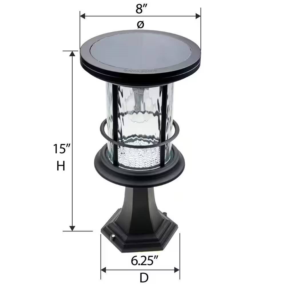 • THREE MOUNTING OPTIONS ñ This versatile solar landscaping light comes with the accessibility to mounting the unit as an outdoor wall sconce, on flat surfaces such as pillars or columns or at the top of a 3-inch outside diameter lamp post (post not included). Black metal case and rain glass accents any style.