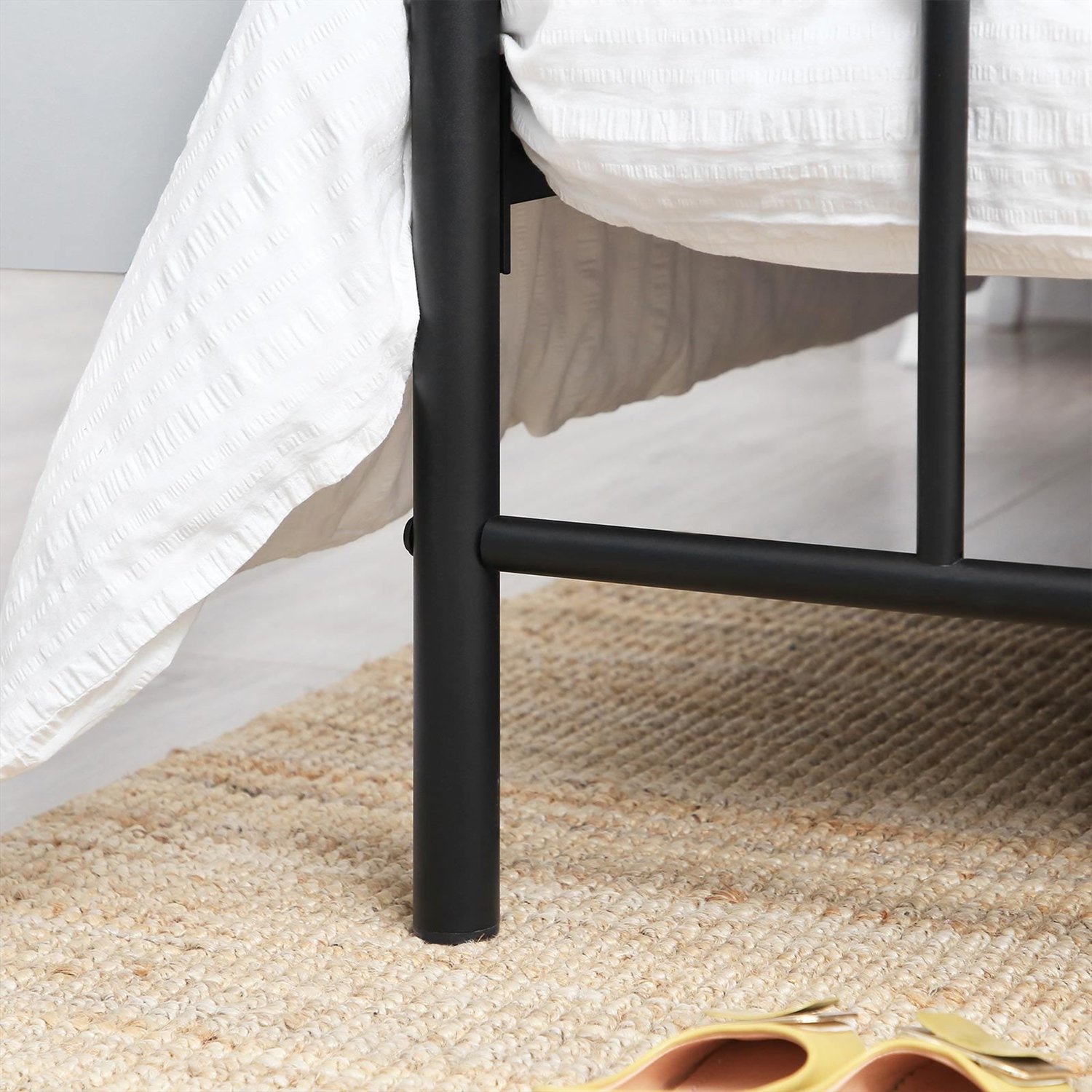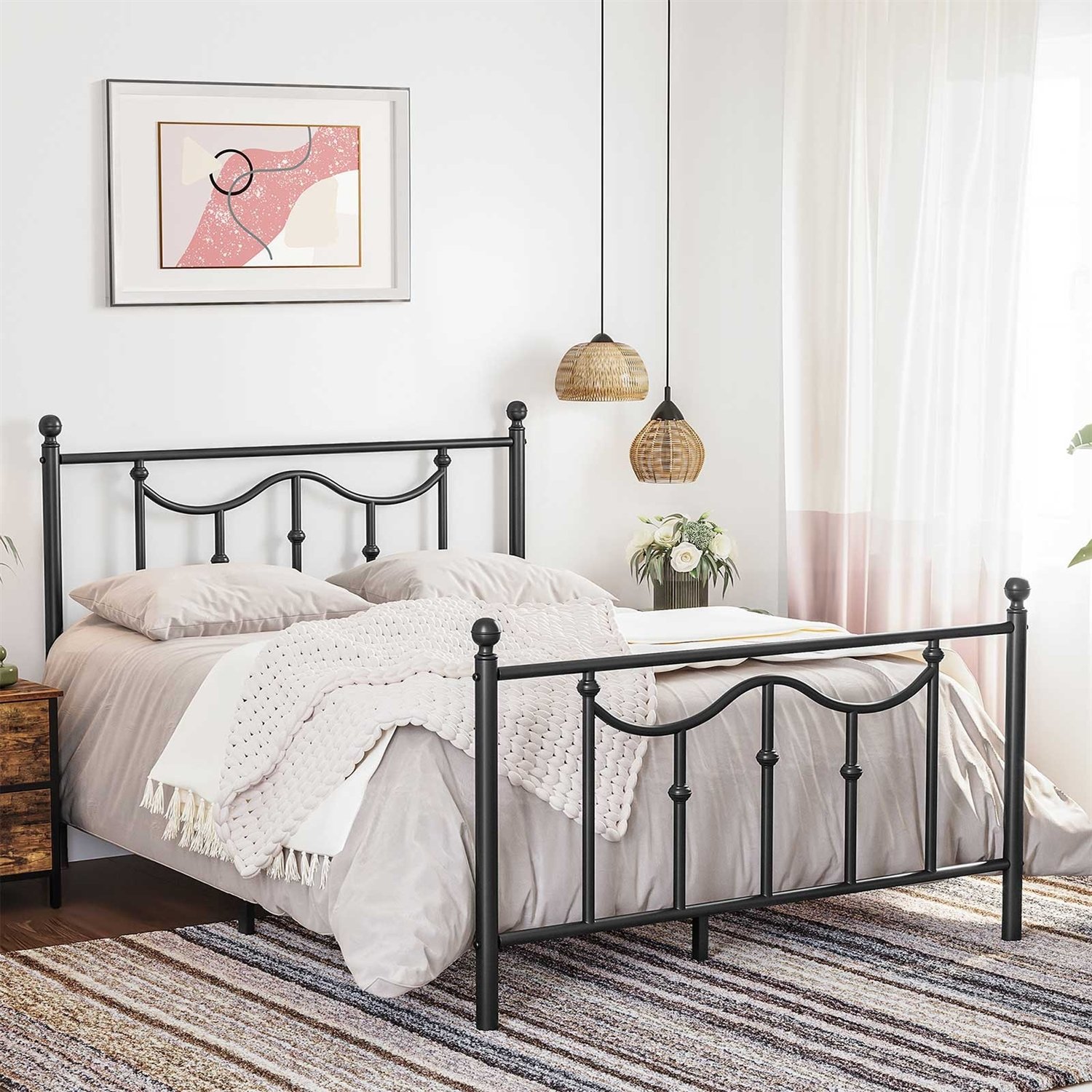 Modern vintage lover rejoice with the Vintage Queen Size Black Metal Platform Bed Frame with Headboard and Footboard. Curved headboard, matte black frame, and joint castings this queen size metal bed frame inspired by the Victorian era will be sure to infuse vintage and antique accents into your bedroom. : A metal frame, 13 metal support bars, and 4 H-shaped mattress brackets to keep your mattress from sagging without the need for a boxspring; 9 metal legs offer a sturdy foundation. Clear out the boxes stuffed in your bedroom corner and hide them out of sight under this queen size bed frame boasting 13 inches of space, keeping them organized and easy to grab the moment you need them.