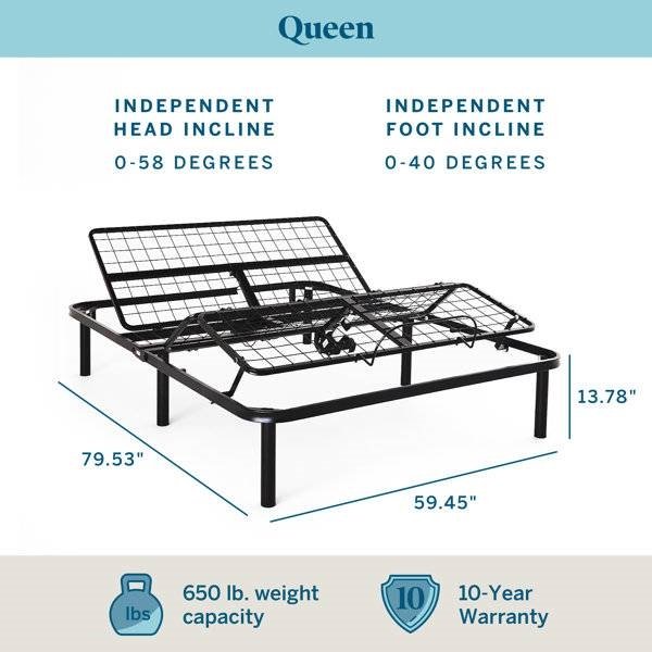 This Adjustable Full Electric Steel Bed Base with Remote in Queen Size provides a better way to sleep. Itís now easier than ever to read, watch TV, or relax in bed. Youíll love modifying your sleep experience with the head and foot-up positions controlled by a wired remote. This adjustable bed base fits well with most memory foam mattresses and bed frames, making any bed transition seamless. Added health benefits include reduced sleep apnea, acid reflux, and snoring. Comfort awaits. Mattress is NOT included.