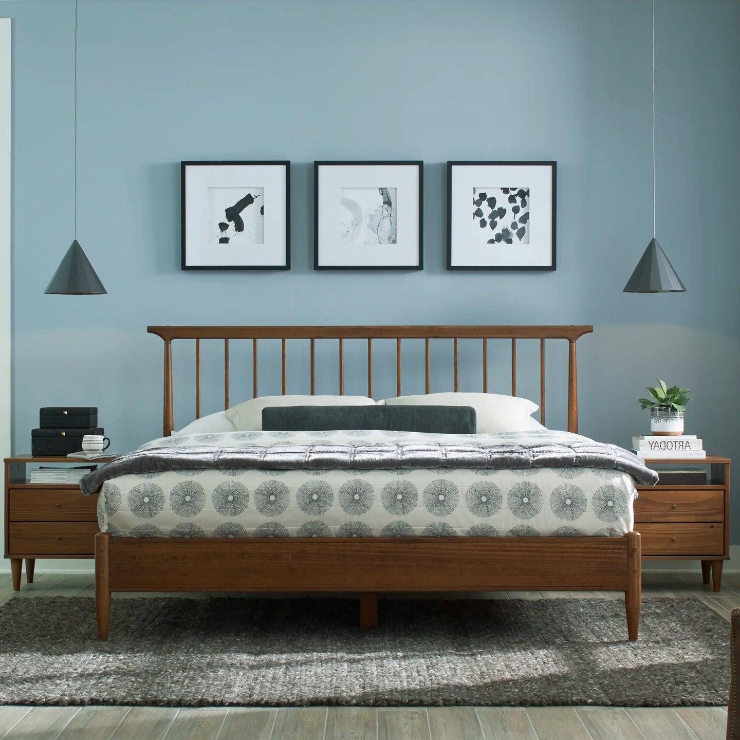 While the design looks lightweight, the Mid Century Platform Bed is amazingly sturdy thanks to its solid eucalyptus hardwood and solid pine wood construction. Details on the headboard posts are eye-catching without detracting from the organic simplicity and levity of the mid-century modern design. In the rear of the headboard, a metal angle provides a secure anchor for the hardwood spindles. Designed for online sales, our beds will ship quickly in durable packaging with user-friendly assembly instructions.