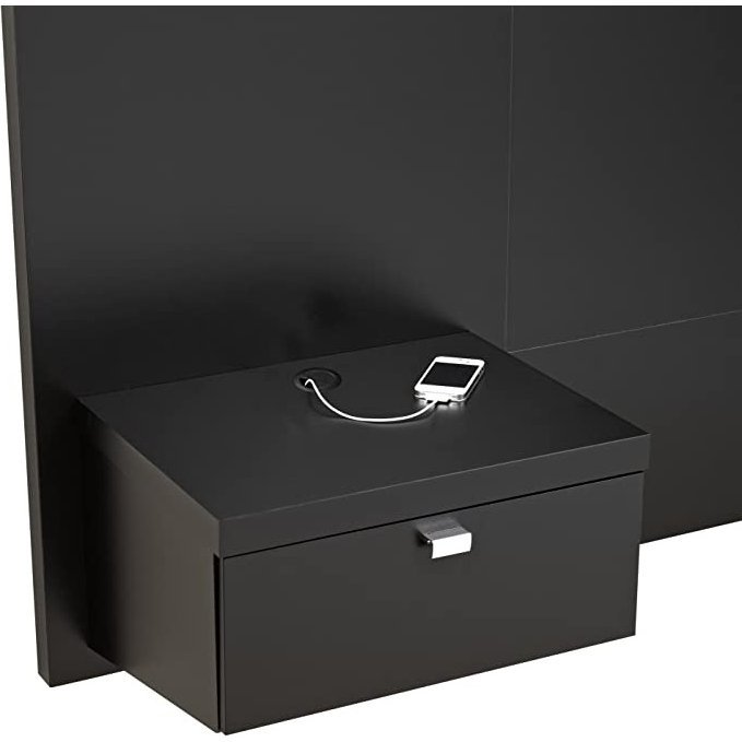 This Queen size Floating Headboard with Nightstands in Black with nightstands maximizes your available floor space with it's elevated, off the floor design. With a focus on simplicity and functional storage, this unit creates a modern and sleek bedroom. Two built-in nightstands extend from the headboard featuring drawers for out-of-site storage and a surface for your reading lamp and favorite books. To maintain its clean lines, both nightstands feature hidden wire management for lamp cords, alarm clock cords or phone chargers. Installing the Floating Headboard at any height is simple, thanks to its innovative hanging rail mounting system. Its gravity defying design makes it the perfect companion to platform storage bed, leaving open floor space for easy access to the storage drawers below. Proudly manufactured in North America using CARB-compliant, laminated composite wood. Ships Ready to Assemble with an instruction booklet for easy assembly