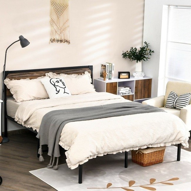 This Rustic FarmHome Metal Wood Platform Bed Frame in Queen Size combines a simple rustic industrial Farm House style. Comes with a sturdy black metal bed frame and vintage wooden headboard. Constructed of powder-coated steel slats, the metal bed frame ensures rugged and durable structure. 5 reinforced support legs and solid screws enhance its overall stability and provide better support for the bed frame. Bed has 13.5 inches under-bed storage space to store boxes, suitcase and other items.