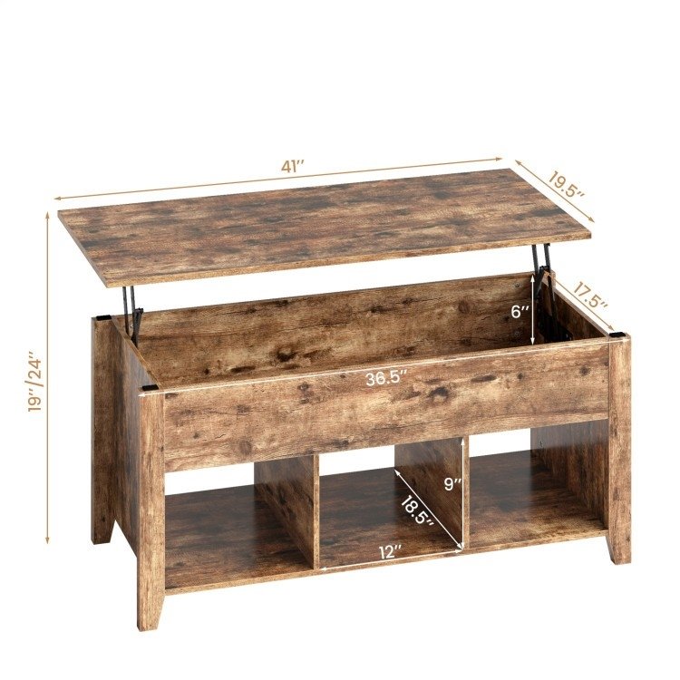 This sturdy mufti purpose Rustic Farmhouse Tan Wooden Lift Top Coffee Table is a great addition to any sitting space. The top of this rustic coffee table can be lifted up, with the durable solid lifting mechanism inside. The lifting mechanism is made of iron, ensuring long-term use. The springs at 2 sides help you to lift the top up and lower down, the height can be fixed at 24 inches to meet your various needs. Under the top, this table hides a large space to store your daily objects. You can put books, magazines, remote controls, keeping them in reach and away from dust. Comes with 3 open shelves at the bottom can collect blankets, toys, or snacks, improving space utilization.