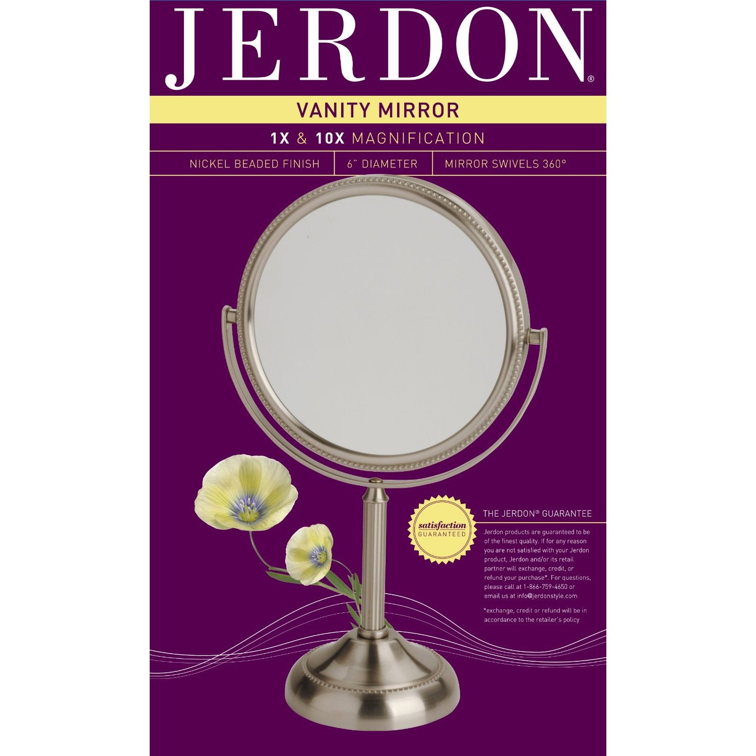 This Small Round Table Top Vanity Mirror - 10X Magnification stands upright on countertops, vanities and tables and its lustrous finish is perfect for the bathroom. What makes this mirror unique is its swivel design and stabilized base. The Jerdon JP910NB 6-Inch Table Top Mirror is 6-inches in diameter and features a 10x magnification. This mirror has two reflective sides that swivel for a regular or a 10x magnification mirror. This product glides with the touch of a finger, but is firm enough to hold its place for odd angles. The Jerdon JP910NB First Class Table Top Mirror is 11-inches (H) and adjusts to all angles for a dynamic point of view. Jerdon provides a 1-year, limited warranty that protects against any defects due to faulty material or workmanship. Jerdon Style has earned a reputation for excellence in the beauty industry with its broad range of quality cosmetic mirrors (including vanity, lighted and wall mount mirrors), hair dryers and other styling appliances. Since 1977, the Jerdon brand has been a leading provider to the finest hotels, resorts, cruise ships and spas worldwide. Jerdon continues to evolve with and shape how stylists envision beauty and fashion.