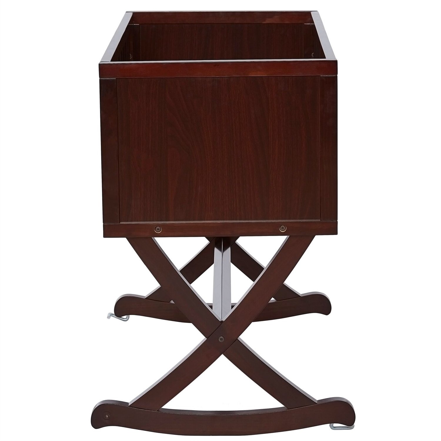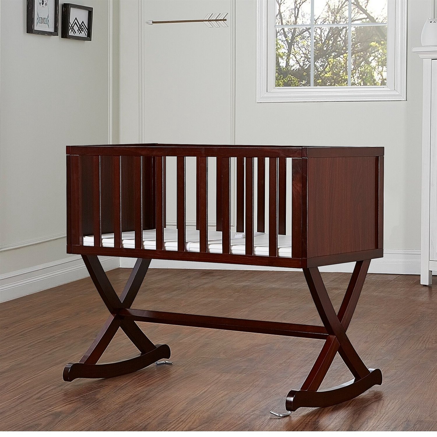 This Cherry Finish Wood Rocking Baby Glider Cradle with Crib Mattress creates a cozy nest-like surrounding for your newborn. This cradle offers a simple and modern design by incorporating straight lines, a solid side panel with a soft mattress pad, and an x-cross base, which allows parents to rock gently their babies to sleep with sophisticated iron decors and pops of geometric prints that inspire a plush, peaceful, all-night comfort.