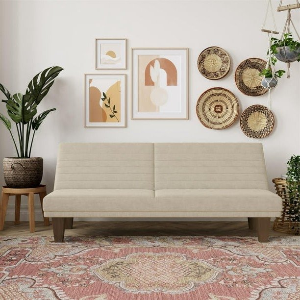 This Tan Modern Upholstered Microfiber Adjustable Futon Sleeper Sofa is the perfect piece for any home. Whether you are looking for extra seating in your living room, family room, or home office, this futon has all the features you are looking for. With its simple silhouette and neutral color options, this futon can easily and beautifully complement the existing dÈcor of any room, no matter the style. Equipped with a simple push and pull mechanism, the backrest can quickly be converted between a sitting, lounging, and sleeping position to accommodate any situation. This futon is built with a sturdy wood frame and a soft-to-the-touch microfiber upholstery that will withstand years of unexpected overnight guests and mid-day naps.